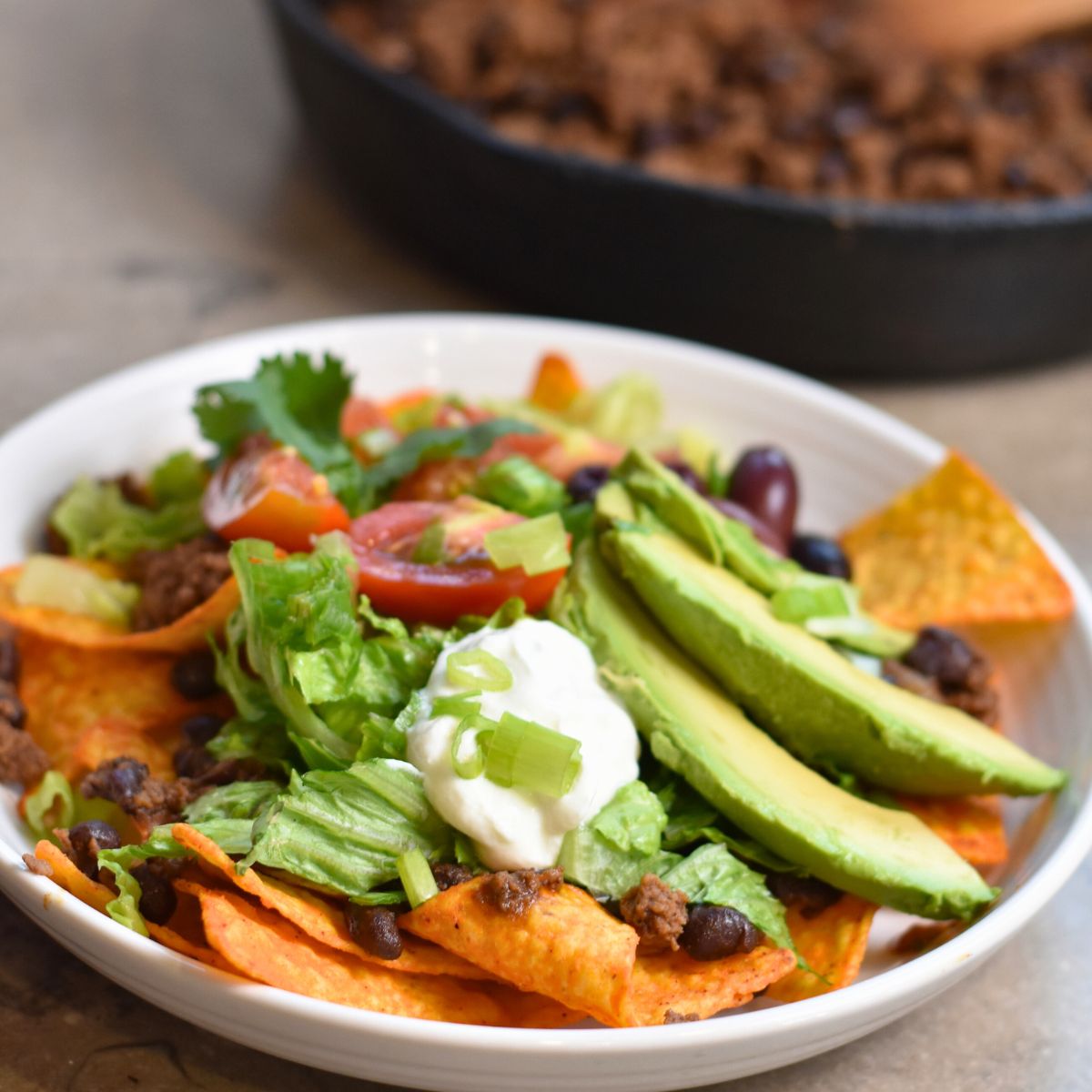 - Build your taco salad with chips, ground beef/bean mixture, and all the toppings you like.